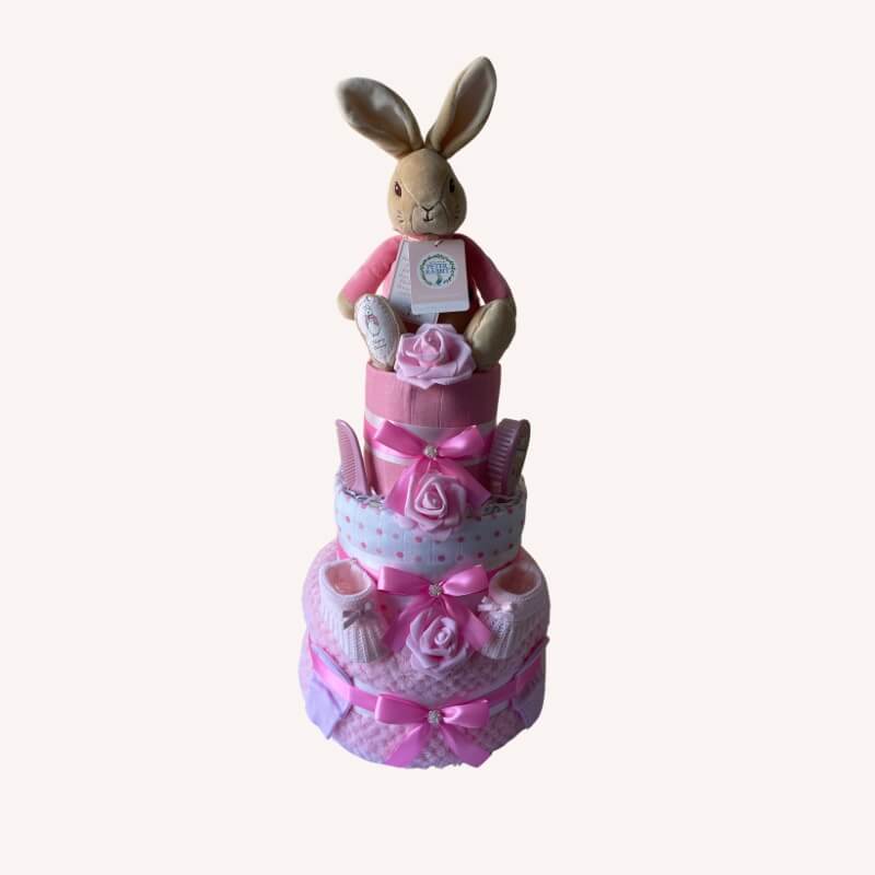 Everyone loves Flopsy Bunny and this Girls Nappy Cake is no exception, 3 tiers of baby essentials plus the wonderful rabbit toy